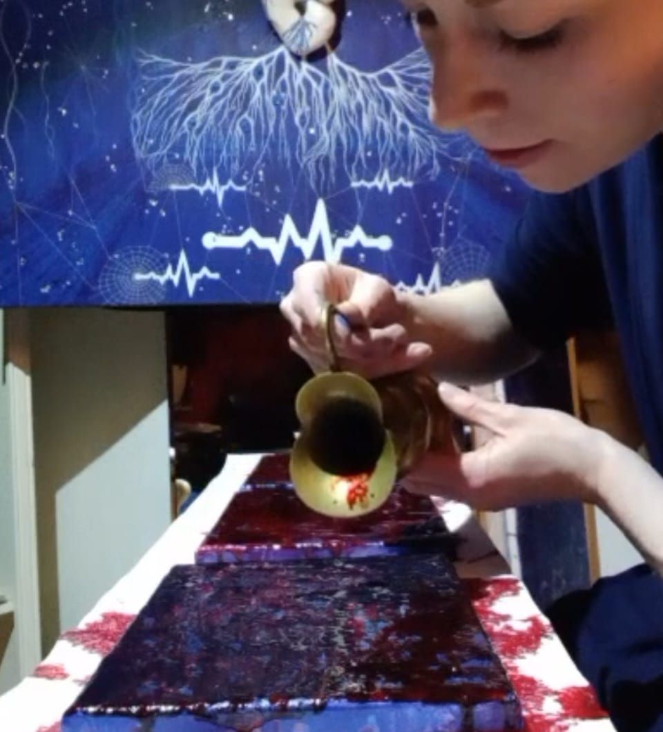 Als zeitgenössische Künstlerin erschaffe ich mit Blut & Feuer neuartige meist abstrakte Formen & Farben, die an neuronale, organische, extraterrestrische Strukturen erinnern. Ich arbeite mit mixed media voller experimenteller Neugier & Faszination, teils zeremonieller Hingabe ob der Schönheit & Bedeutsamkeit des Blutes & des Feuers, Symbole für die Seele, Leben & Tod, Emotionen, Identität u.v.m. (Acrylfarben, Blut, Feuer, Epoxidharz, Spiegel, Steine, LEDs, Leuchtsand, Gold, Modelliermasse).