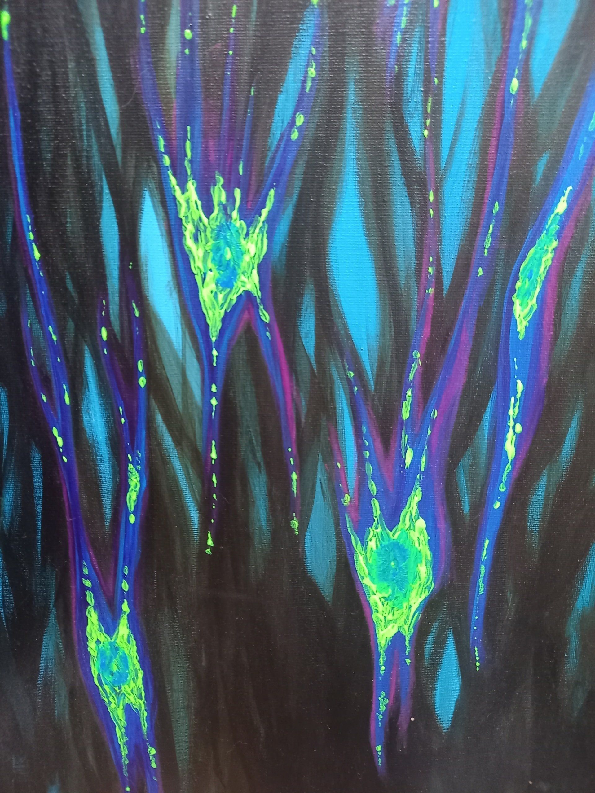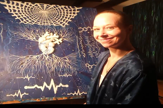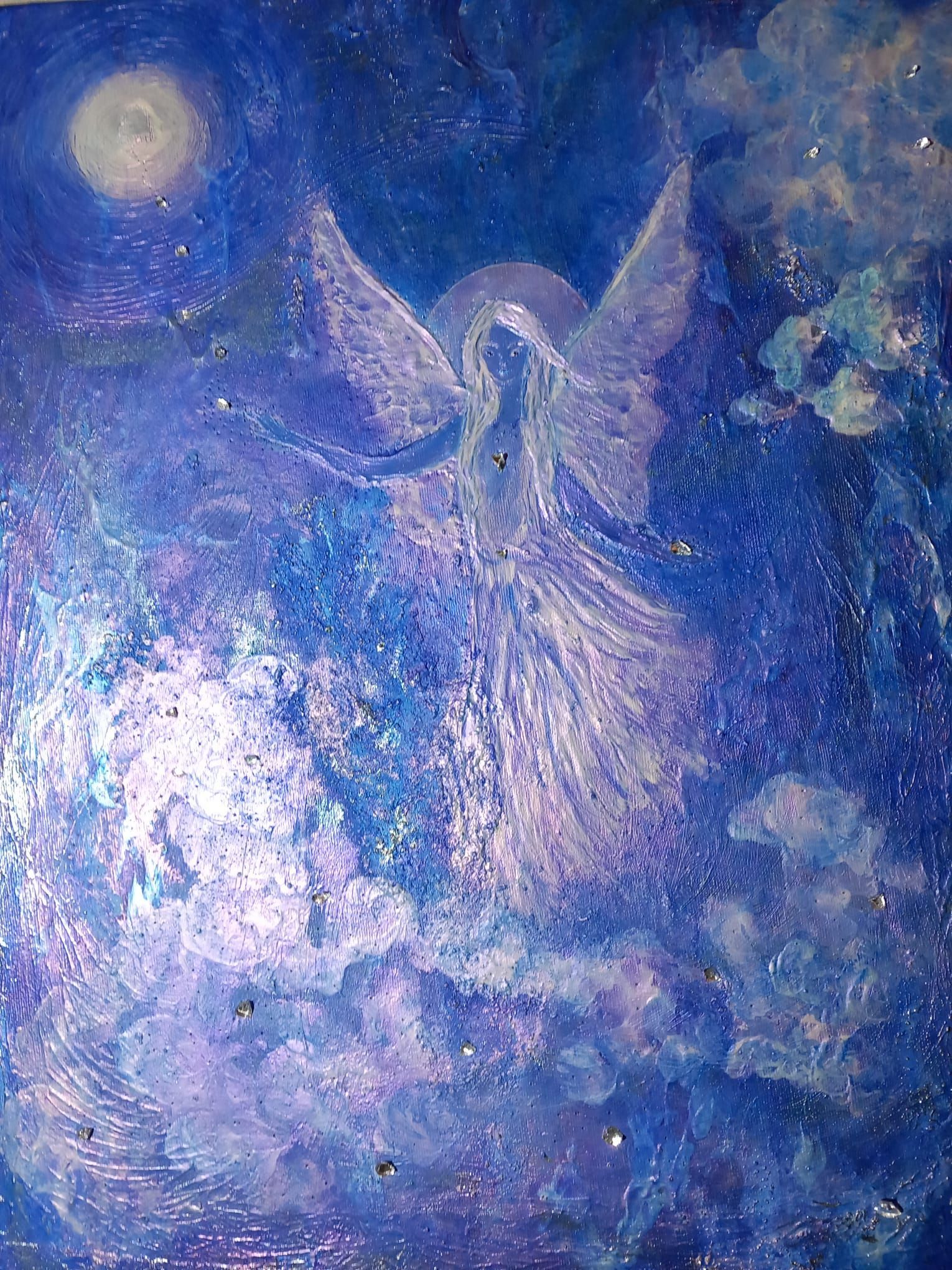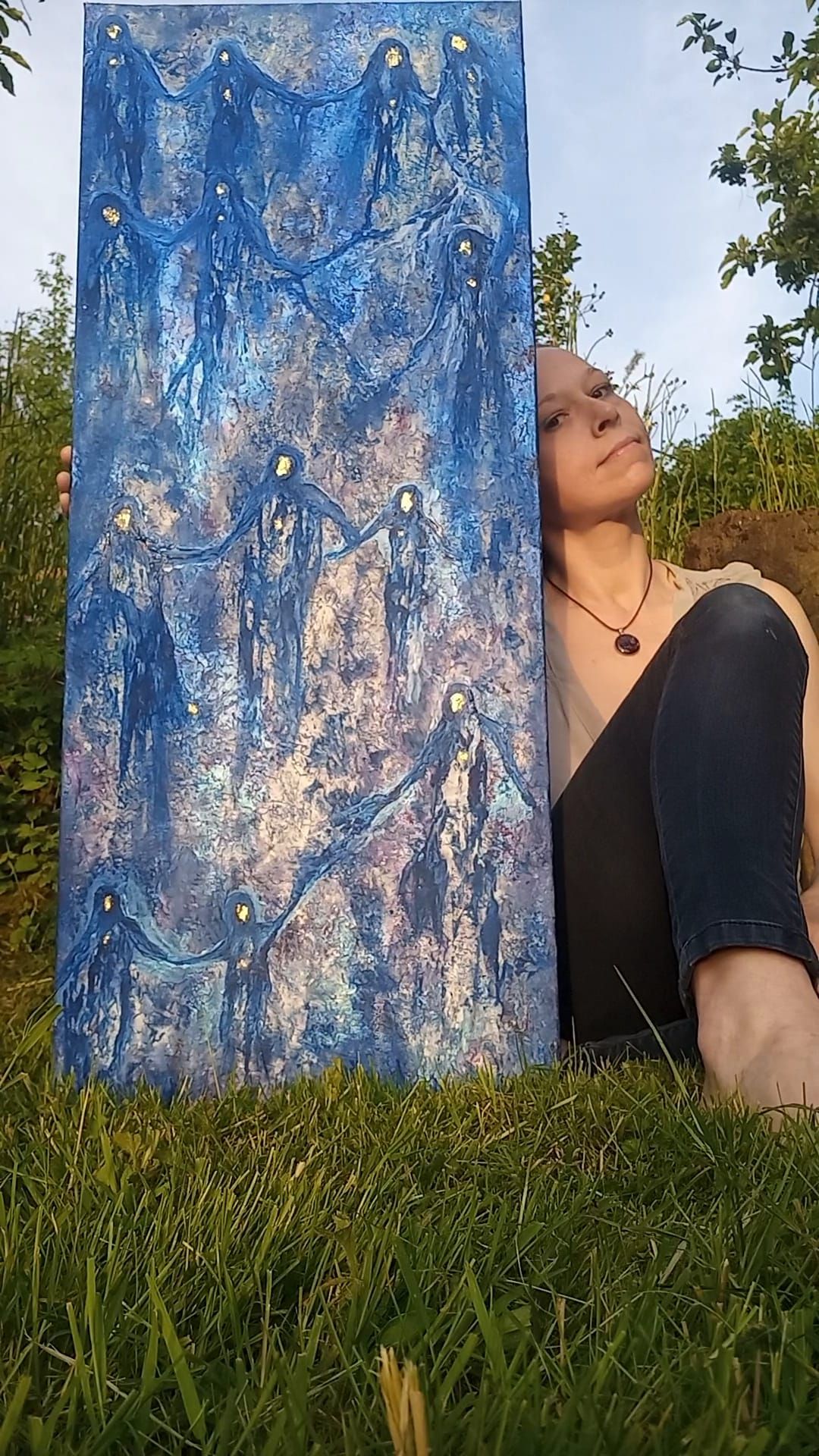 (...) Ich begann, mit Fäden auszuprobieren, um ein spinnennetzähnliches Material, also mit Nadel und Faden, einzubinden und so entstand die Idee, neben den genähten Netzen auch Verbindungen mit den Fäden und mit vielen kleinen Nadelstichen Licht/Energiepunkte ins Bild zu bringen. Für die Mitte modellierte ich ein Herz, bestückte es mit Mini Magneten, verzierte es mit Spiegelsplittern und formte ein Loch, durch das man in das Innere des Herzens sehen kann (Videos, Musik, Bilder, Geschichten durch an der Rückseite angebrachtes Smartphone). Es kamen weitere Malereien (Adersystem bzw. Geäst und Wurzeln) hinzu. Erst dann kamen die Spiegelstücke im Bild hinzu, die versehentliche Macken verdecken sollten und sich als „Sterne“ herausstellten, weil sie im Vorbeigehen so schön glitzerten auf dem dunklen Blau, was ich aufgriff und auf das ganze Werk ausgewählte Spiegelsplitter klebte, teils angeordnet wie real bekannte Sternbilder. Alle Motive, die ich gemalt hatte, durchlöcherte ich nach und nach mit Nadelstichen, was teils hypnotisch war. Zu guter Letzt wurde auch das Herz noch vernäht, sodass die Fäden, die es mit dem Bild verbinden, wie Saiten gespannt sind und auch „klingen“. Auf die linke Seite malte ich eine „message to humanity“ in Form eines Hexadezimal-codes, was ich aber zumindest optisch nicht stimmig fand und wieder komplett verwischte. Message war der Beginn eines Zitates von Nikola Tesla: „Der Tod existiert nicht, und mit diesem Wissen verschwindet die Angst davor. Und denk daran: Kein Mensch, der existiert hat, ist gestorben. Sie wurden zu Licht und existieren als solche immer noch. Das Geheimnis ist, dass diese Lichtteilchen in ihren ursprünglichen Zustand zurückkehren. Zurück zu einer der vorherigen Energien. Christus und einige andere kannten dieses Geheimnis. Ich suchte danach, wie man die menschliche Energie bewahrt. Es ist eine der Formen des Lichts in der Seele, manchmal gleich dem höchsten himmlischen Licht. Ich habe nicht für mich allein danach gesucht. Sondern zum Wohle aller. Ich glaube, dass meine Entdeckung das Leben der Menschen einfacher und erträglicher machen kann und sie möglicherweise auf Spiritualität und Moral lenken wird.“ Weil ich lange nach einer Botschaft gesucht habe und sie zwar nicht mehr sichtbar, aber trotzdem vorhanden ist, habe ich dieses Bild diesen zweiten Namen bzw. (Unter-) Titel gegeben. Es gibt in dem Bild zudem 2 Stellen mit Nadelstichstellen, die nicht durchleuchten, weil ich sie teils verschlossen bzw. übermalt habe, aber die dennoch zu sehen sind: „DNA“ (Mitte unten) sowie die Zahl „phi“ (goldener Schnitt). Als Highlight habe ich einen Lichterschlauch mit Farbwechsel und Musik-Reaktion an der Rückseite des Bildes befestigt, sodass alle Nadelstiche als Energiepunkte leuchten und sich je nach Einstellung des Lichter /Farbschlauches bewegen können. Ich hatte nie vor, dieses Bild mit diesen Motiven und Einzelheiten zu erschaffen, der ganze Prozess lief schrittweise intuitiv und „geleitet“ ab, alles ergab sich auseinander . und besonders die letzte Phase verschaffte mir Momente des Staunens und der „Ungläubigkeit“, wie die einzelnen Schritte und Teile am Ende dieses große Ganze ergaben. Durch diesen Prozess habe ich gefühlt unendlich neue Ideen und Techniken sowie Gefühle und „Erkenntnisse“ für bzw. über mich und die Bedeutung von Kunst (für mein Seelenheil, mein Leben) geschöpft. Das Bild hat mich oft ergriffen und ich fühlte mich von den Eindrücken „überwältigt“, es wurde teils tranceartig und rhythmisch erstellt und ich habe mit ihm getanzt, durch es hatte ich Erlebnisse der „ozeanischen Selbstentgrenzung“/“Transzendenz“. So genannte "Peak-Experiences" (Gipfel-Erfahrungen) wurden u.a. von Abraham Maslow, erforscht und beschrieben: „Ich fand, dass diese Personen vielfach berichteten, dass sie etwas wie mystische Erfahrungen hatten, Augenblicke großer Ehrfurcht, Momente höchsten Glücks oder gar der Verzückung, Ekstase oder Seligkeit (denn das Wort Glück kann zu schwach sein, um diese Erfahrung zu beschreiben). Dies waren Augenblicke reinen, positiven Glücks, wo alle Zweifel und Ängste, alle Hemmnisse, Spannungen und Schwächen zurückgelassen wurden. Dabei verlor sich das Selbst-Bewusstsein. Alle Getrenntheit und Entfernung von der Welt verschwand, während sie sich eins mit der Welt fühlten, mit ihr verschmolzen, wirklich in dieser Welt und zu ihr gehörend, statt draußen zu sein und von dort hereinzuschauen. (Quelle: “Spirituelle Dimensionen Des Singens | Akademie Für Singen, Natur & Gesundheit (healingsongs.de) ".Während der Phase 2 und 3 habe ich einige Musikstücke Schlange gehört und einige Phasen wie das Durchstechen mit Nadeln mit Herzschlaggeräusch in Kombi mit Gewittergeräuschen und/oder Meditationsmusik.