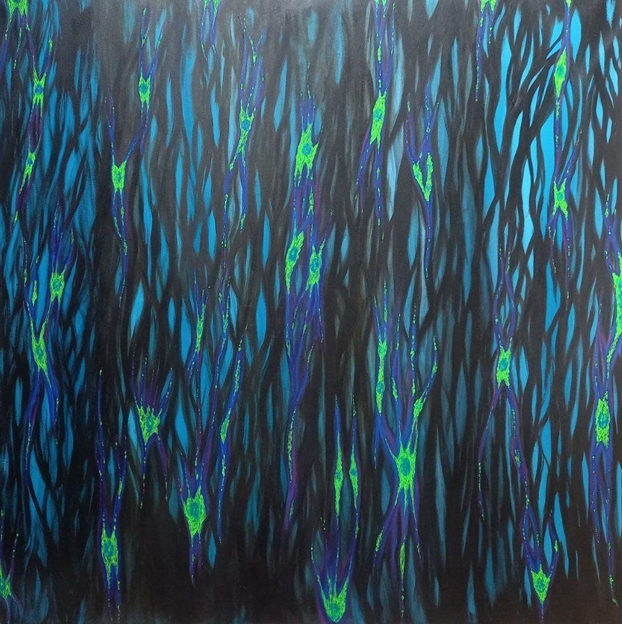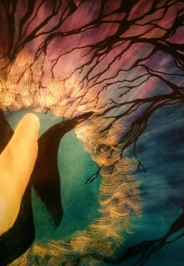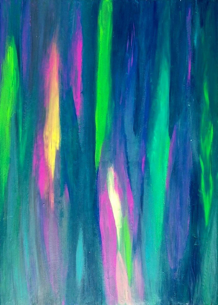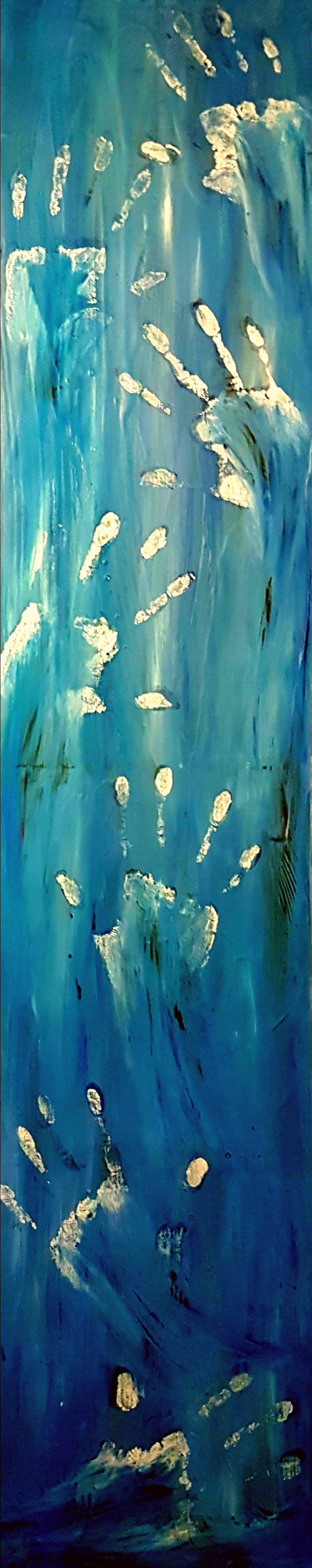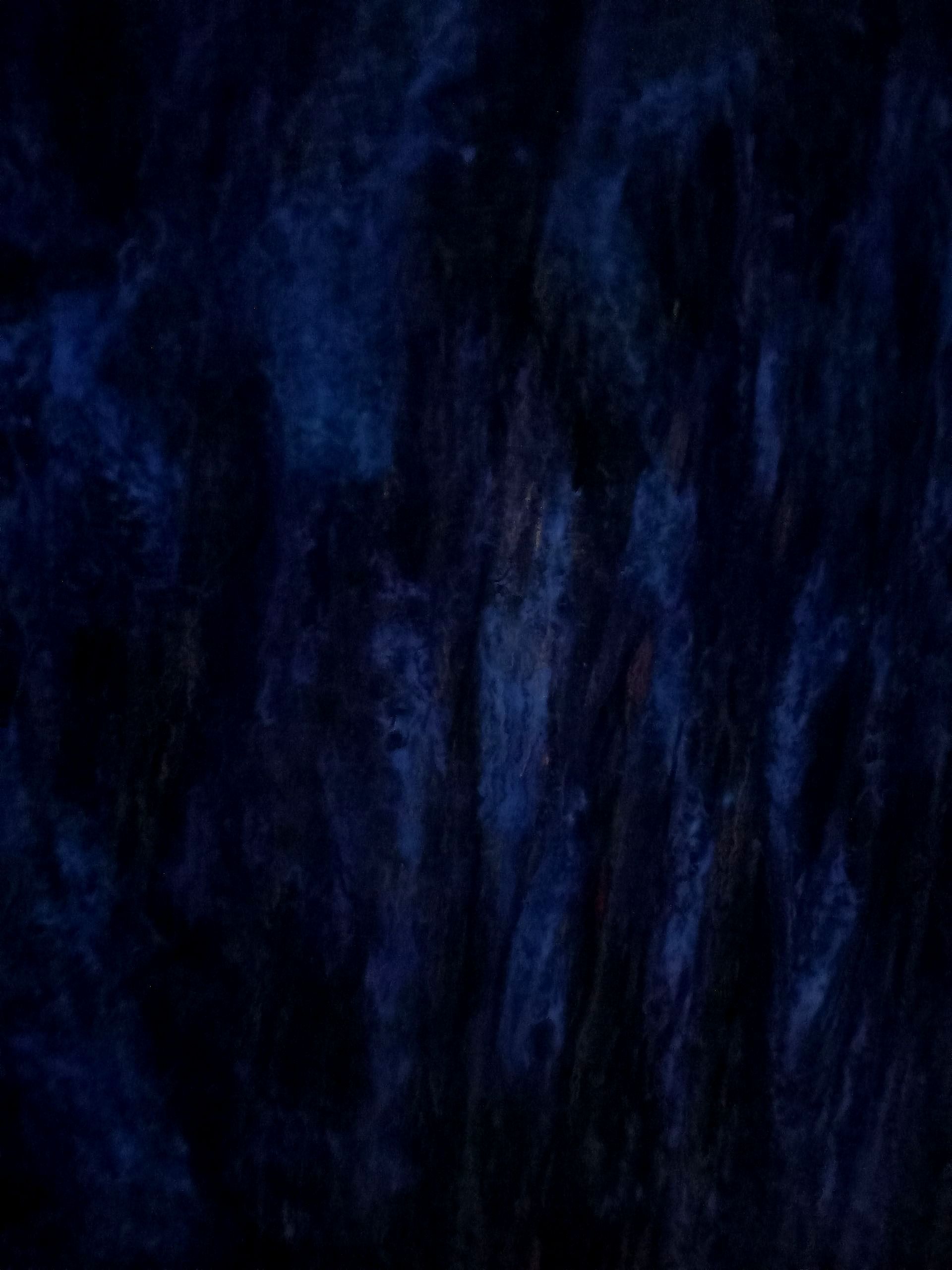 (...) Ich begann, mit Fäden auszuprobieren, um ein spinnennetzähnliches Material, also mit Nadel und Faden, einzubinden und so entstand die Idee, neben den genähten Netzen auch Verbindungen mit den Fäden und mit vielen kleinen Nadelstichen Licht/Energiepunkte ins Bild zu bringen. Für die Mitte modellierte ich ein Herz, bestückte es mit Mini Magneten, verzierte es mit Spiegelsplittern und formte ein Loch, durch das man in das Innere des Herzens sehen kann (Videos, Musik, Bilder, Geschichten durch an der Rückseite angebrachtes Smartphone). Es kamen weitere Malereien (Adersystem bzw. Geäst und Wurzeln) hinzu. Erst dann kamen die Spiegelstücke im Bild hinzu, die versehentliche Macken verdecken sollten und sich als „Sterne“ herausstellten, weil sie im Vorbeigehen so schön glitzerten auf dem dunklen Blau, was ich aufgriff und auf das ganze Werk ausgewählte Spiegelsplitter klebte, teils angeordnet wie real bekannte Sternbilder. Alle Motive, die ich gemalt hatte, durchlöcherte ich nach und nach mit Nadelstichen, was teils hypnotisch war. Zu guter Letzt wurde auch das Herz noch vernäht, sodass die Fäden, die es mit dem Bild verbinden, wie Saiten gespannt sind und auch „klingen“. Auf die linke Seite malte ich eine „message to humanity“ in Form eines Hexadezimal-codes, was ich aber zumindest optisch nicht stimmig fand und wieder komplett verwischte. Message war der Beginn eines Zitates von Nikola Tesla: „Der Tod existiert nicht, und mit diesem Wissen verschwindet die Angst davor. Und denk daran: Kein Mensch, der existiert hat, ist gestorben. Sie wurden zu Licht und existieren als solche immer noch. Das Geheimnis ist, dass diese Lichtteilchen in ihren ursprünglichen Zustand zurückkehren. Zurück zu einer der vorherigen Energien. Christus und einige andere kannten dieses Geheimnis. Ich suchte danach, wie man die menschliche Energie bewahrt. Es ist eine der Formen des Lichts in der Seele, manchmal gleich dem höchsten himmlischen Licht. Ich habe nicht für mich allein danach gesucht. Sondern zum Wohle aller. Ich glaube, dass meine Entdeckung das Leben der Menschen einfacher und erträglicher machen kann und sie möglicherweise auf Spiritualität und Moral lenken wird.“ Weil ich lange nach einer Botschaft gesucht habe und sie zwar nicht mehr sichtbar, aber trotzdem vorhanden ist, habe ich dieses Bild diesen zweiten Namen bzw. (Unter-) Titel gegeben. Es gibt in dem Bild zudem 2 Stellen mit Nadelstichstellen, die nicht durchleuchten, weil ich sie teils verschlossen bzw. übermalt habe, aber die dennoch zu sehen sind: „DNA“ (Mitte unten) sowie die Zahl „phi“ (goldener Schnitt). Als Highlight habe ich einen Lichterschlauch mit Farbwechsel und Musik-Reaktion an der Rückseite des Bildes befestigt, sodass alle Nadelstiche als Energiepunkte leuchten und sich je nach Einstellung des Lichter /Farbschlauches bewegen können. Ich hatte nie vor, dieses Bild mit diesen Motiven und Einzelheiten zu erschaffen, der ganze Prozess lief schrittweise intuitiv und „geleitet“ ab, alles ergab sich auseinander . und besonders die letzte Phase verschaffte mir Momente des Staunens und der „Ungläubigkeit“, wie die einzelnen Schritte und Teile am Ende dieses große Ganze ergaben. Durch diesen Prozess habe ich gefühlt unendlich neue Ideen und Techniken sowie Gefühle und „Erkenntnisse“ für bzw. über mich und die Bedeutung von Kunst (für mein Seelenheil, mein Leben) geschöpft. Das Bild hat mich oft ergriffen und ich fühlte mich von den Eindrücken „überwältigt“, es wurde teils tranceartig und rhythmisch erstellt und ich habe mit ihm getanzt, durch es hatte ich Erlebnisse der „ozeanischen Selbstentgrenzung“/“Transzendenz“. So genannte "Peak-Experiences" (Gipfel-Erfahrungen) wurden u.a. von Abraham Maslow, erforscht und beschrieben: „Ich fand, dass diese Personen vielfach berichteten, dass sie etwas wie mystische Erfahrungen hatten, Augenblicke großer Ehrfurcht, Momente höchsten Glücks oder gar der Verzückung, Ekstase oder Seligkeit (denn das Wort Glück kann zu schwach sein, um diese Erfahrung zu beschreiben). Dies waren Augenblicke reinen, positiven Glücks, wo alle Zweifel und Ängste, alle Hemmnisse, Spannungen und Schwächen zurückgelassen wurden. Dabei verlor sich das Selbst-Bewusstsein. Alle Getrenntheit und Entfernung von der Welt verschwand, während sie sich eins mit der Welt fühlten, mit ihr verschmolzen, wirklich in dieser Welt und zu ihr gehörend, statt draußen zu sein und von dort hereinzuschauen. (Quelle: “Spirituelle Dimensionen Des Singens | Akademie Für Singen, Natur & Gesundheit (healingsongs.de) ".Während der Phase 2 und 3 habe ich einige Musikstücke Schlange gehört und einige Phasen wie das Durchstechen mit Nadeln mit Herzschlaggeräusch in Kombi mit Gewittergeräuschen und/oder Meditationsmusik.