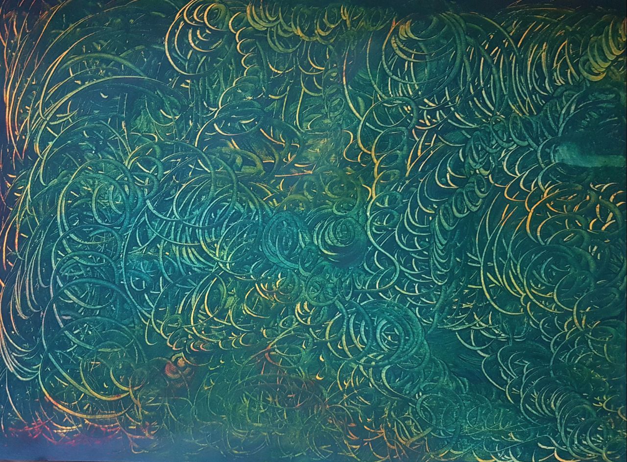 Das ursprüngliche Motiv ist als repräsentative Szene für vergangene traumatischen Lebensabschnitte zu sehen. Alles weitere geschah intuitiv und unerwartet: Der Entstehungsprozess des Bildes bzw. der Verlauf repräsentiert nachfolgende Ereignisse oder Entwicklungen in Form von Lebenslinien/-pfaden, man sagt auch „es ist seit dem eine Menge Wasser den Rhein entlang geflossen“. Die über der Szene liegenden Schichten fühlen sich an als seien sie meine „Existenz“/Leben/Sein auf einer metaphysischen Ebene der Realität, letztere wie „Energiewolken“. Shine! Leuchte! Ist ein Appell des Bildes!