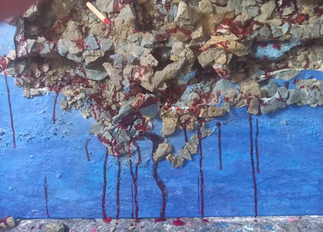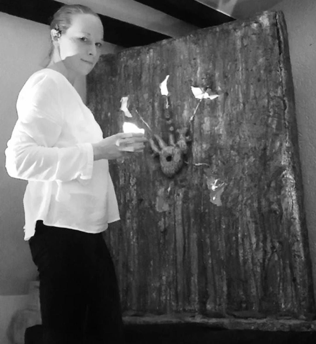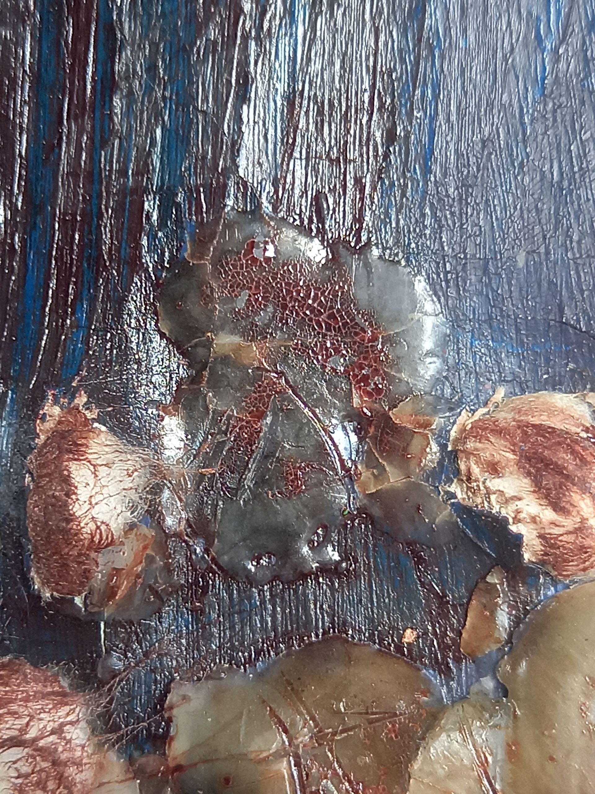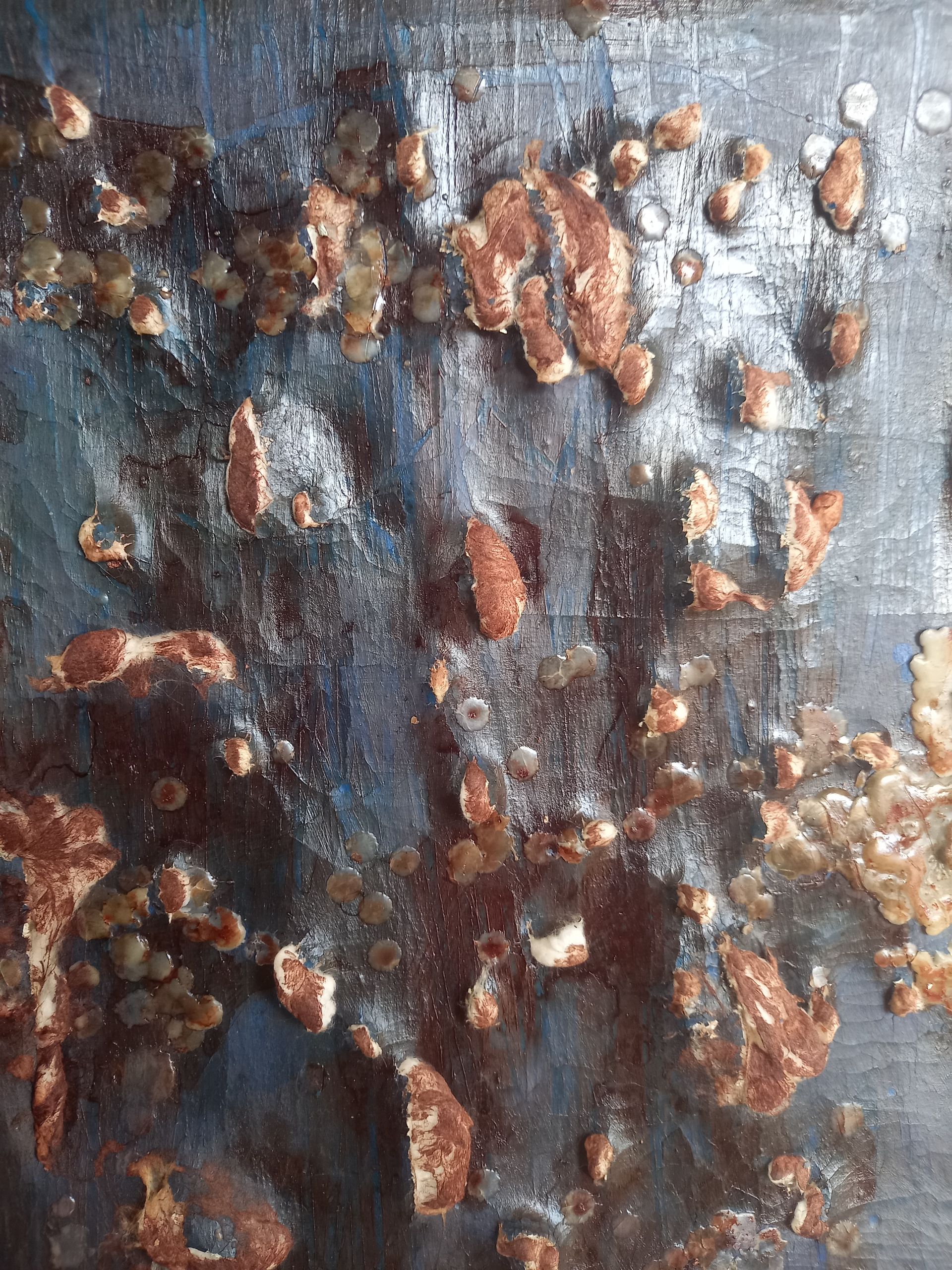 Größe: 95 cm x 120 cm, 12 cm Tiefe mit Sockel/Plateau, Materialien: Acrylfarbe, Beton, Zement, weiße Raumfarbe, Kunst- und Wildschweinblut, verschiedene ätherische Öle, Modelliermasse, Stacheldraht, Blattgold, Spiegelstücke, Powerbank, Steine aus 2 Bächen, Mini-Magnete. Zeitaspekte: ca. 8 Etappen von Oktober 2020 bis März 2021 mit ca. 40 Stunden