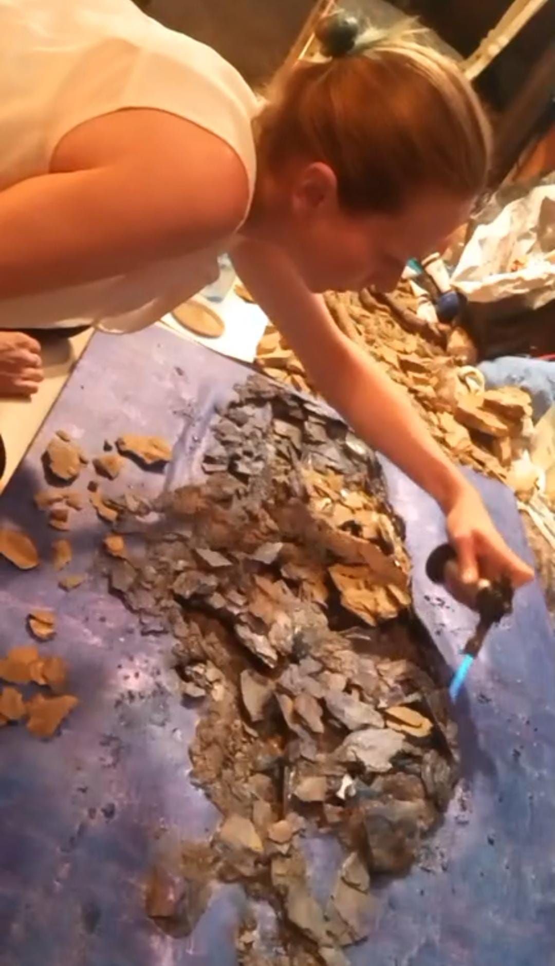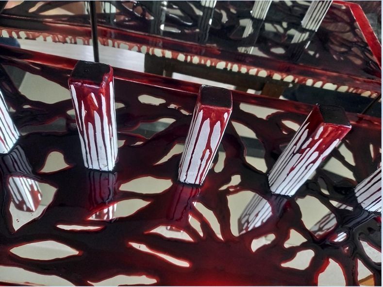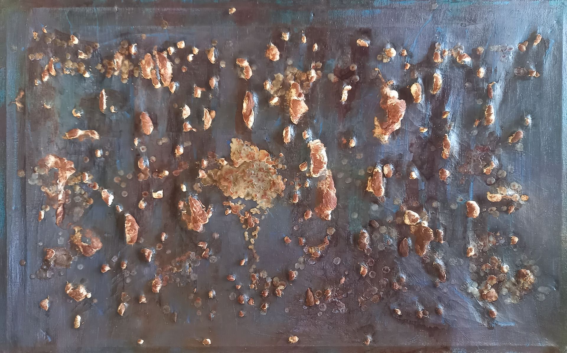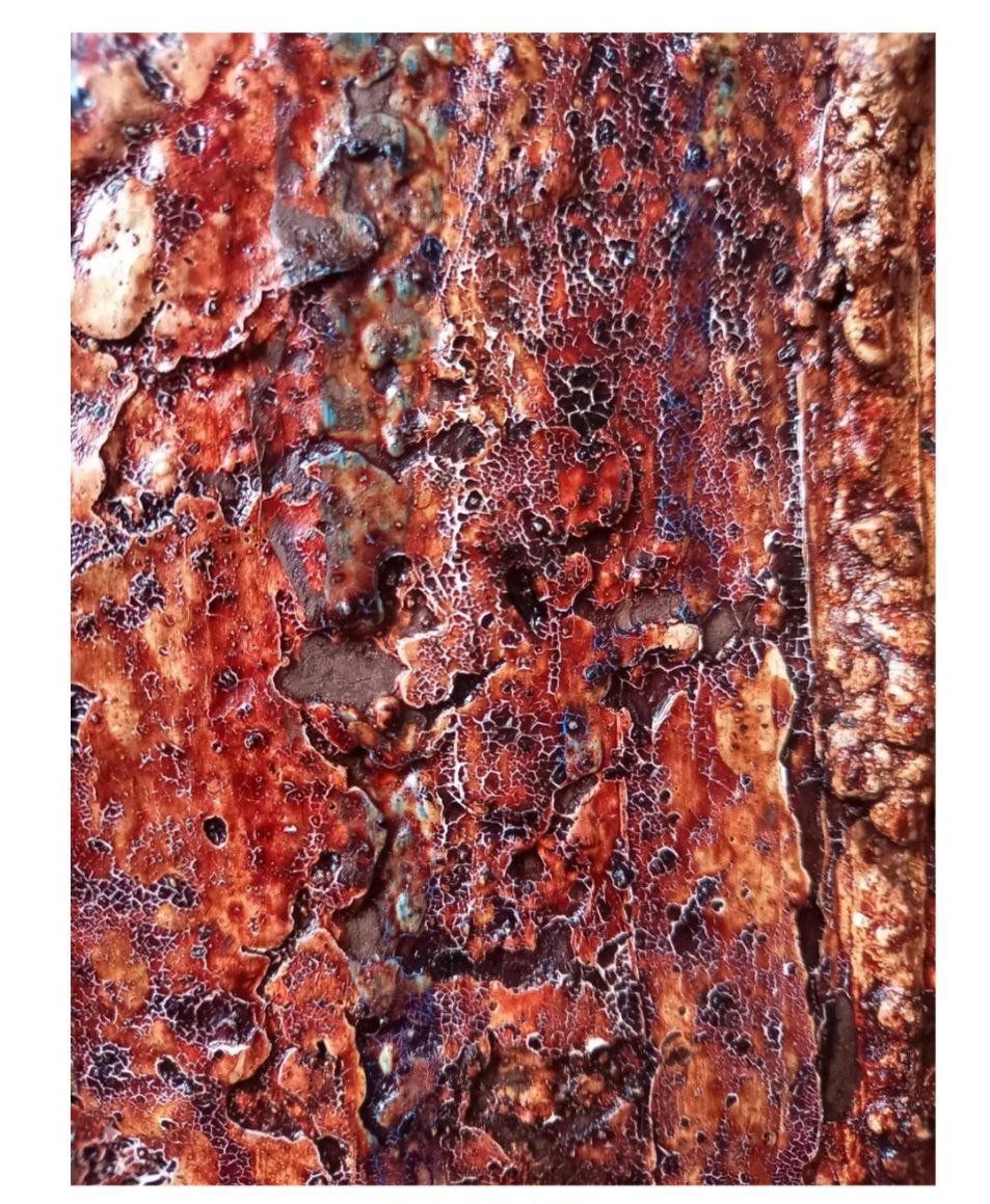 Größe: 95 cm x 120 cm, 12 cm Tiefe mit Sockel/Plateau, Materialien: Acrylfarbe, Beton, Zement, weiße Raumfarbe, Kunst- und Wildschweinblut, verschiedene ätherische Öle, Modelliermasse, Stacheldraht, Blattgold, Spiegelstücke, Powerbank, Steine aus 2 Bächen, Mini-Magnete. Zeitaspekte: ca. 8 Etappen von Oktober 2020 bis März 2021 mit ca. 40 Stunden