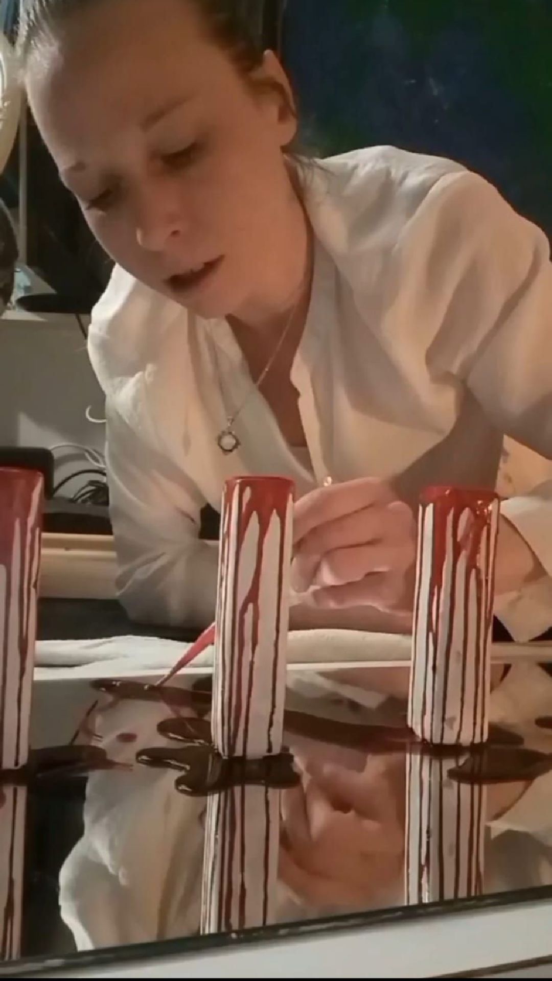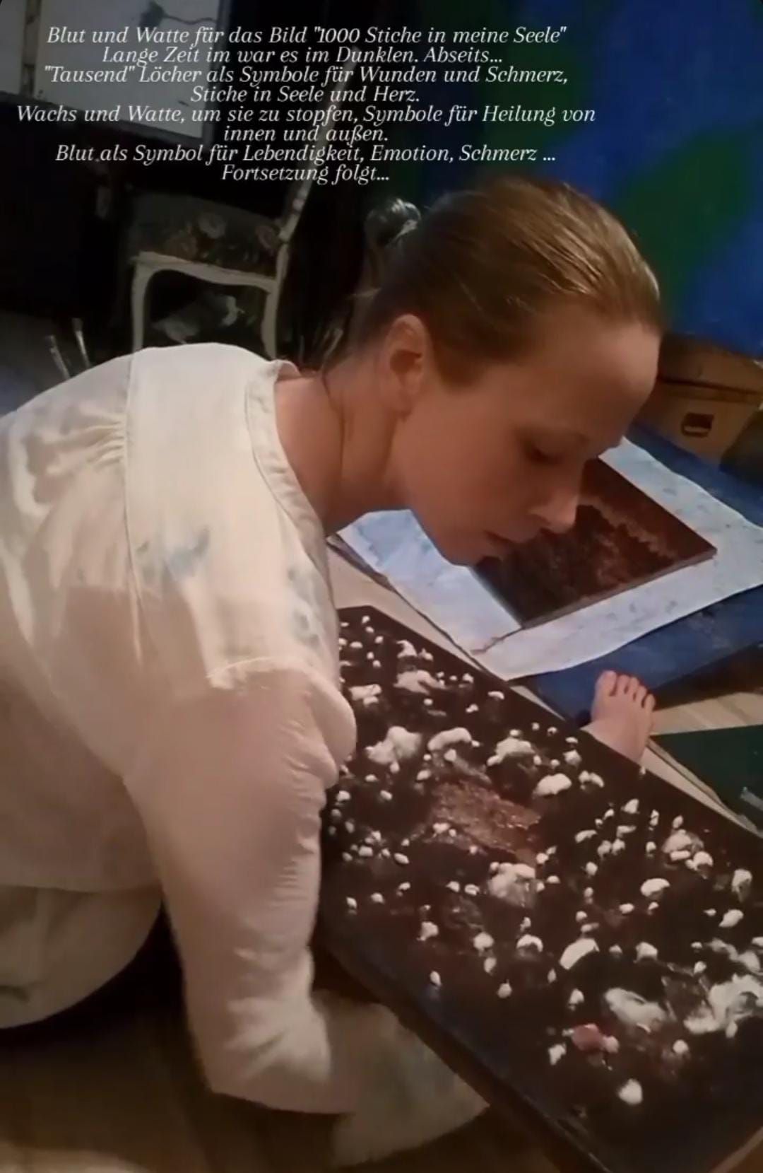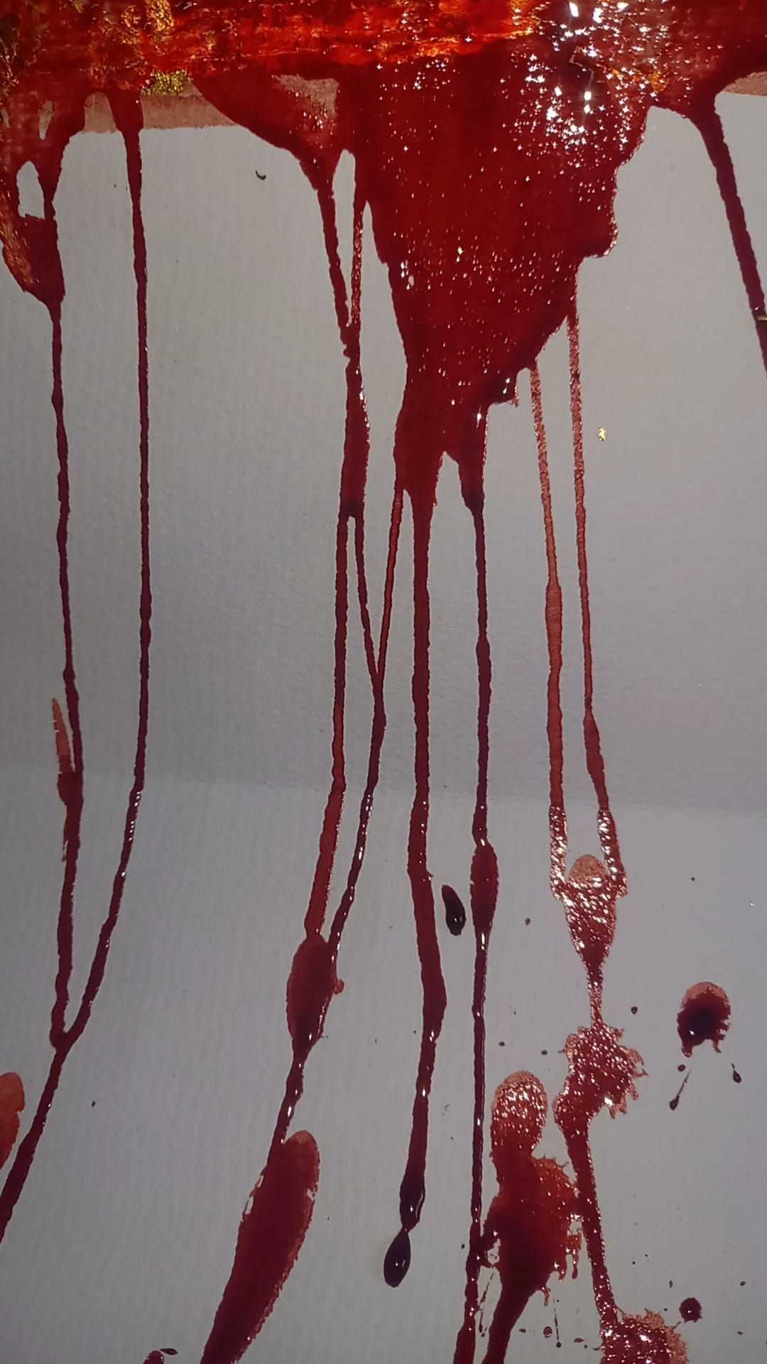 Am besten hat sich angefühlt, dass ich alles bedecken konnte, da ich erst dachte, das Blut würde nicht reichen (normalerweise würde ich auch viel mehr nehmen). Dann die Herzmassage/Abtasten/Handabdrücke ähnlichen Bewegungen. Aber auch der einzelne Tropfen, der an meinem Arm herunter lief, fühlte sich sehr schön an. Es ist einfach so eine krasse Naturfarbe & mit dem Blattgold & Weiß in Kombi sehr schön leuchtend - das ist nicht per Foto/Video einzufangen.... Ich bin immer wieder erfrischt von dieser Leuchtkraft & Farbintensität des Blutes, wenn es frisch bzw noch flüssig ist.