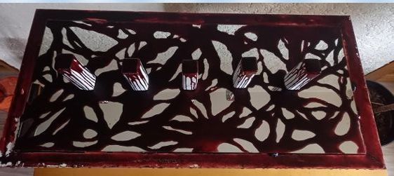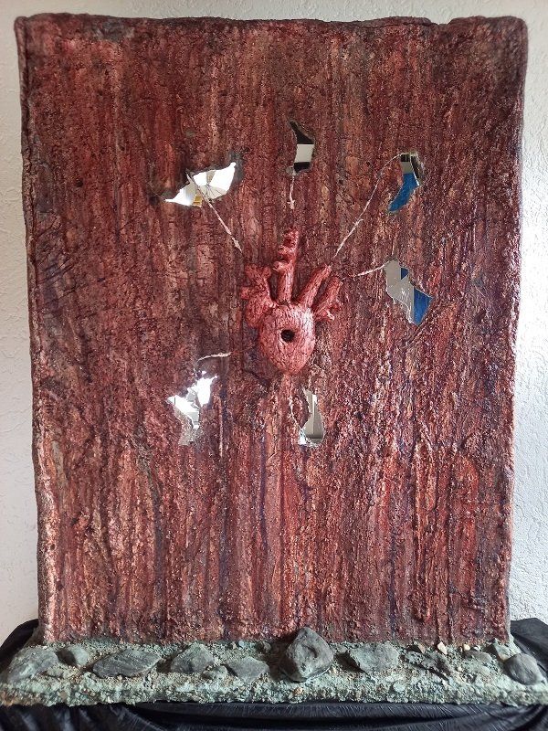 Das Kunstwerk stellt die Mauer um mein Herz dar. Sie umschließt, verdeckt und versteckt es nicht, sondern hält und präsentiert es. Die Mauer hat viele kleinere Risse und an 6 Stellen ist sie weit aufgebrochen bzw. zerstört, wodurch die darunterliegenden Schichten („dünne Haut“) sowie Spiegel als unterste Schicht zu sehen sind. Durch die Löcher in der Mauer sind durch die Spiegel neue Elemente in der Mauer hinzugekommen. Aus dem mehrfach gebrochenen und reparierten Herzen ragen Stacheldrähte in die Mauer hinein. Das Herz ist außen und innen vergoldet sowie mit Spiegelscherben verziert (nur teils sichtbar), außerdem sind einige Mini-Magnete (nicht sichtbar) darin eingebaut. Durch eine Powerbank mit Taschenlampenfunktion, die an der Rückseite des Bildes befestigt und in das Herz gesteckt werden kann, kann das Herz leuchten und blinken, außerdem kann mit dem Herzen per USB seinen Akku laden.Das Herz ist mehrfach gebrochen, aber repariert und mit Stacheldrähten mit der Mauer verbunden bzw. an ihr befestigt, in ihr „verankert“, sodass es „Halt bekommt“. Die Stacheldrähte halten und schützen, können denjenigen der unbefugt Zutritt haben möchte, verletzen. Es ist vergoldet im Inneren, es ist ein Reichtum, man sagt auch jemand hat ein „Herz aus Gold“. Es leuchtet und pulsiert und gibt Energie. Das blinkende Leuchten ist wie ein SOS-Signal, das stehende Leuchten wie ein stilles Licht in der Einsamkeit in der „dunklen Nacht der Seele“ vermischt mit Hoffnung und „Standhaft-Bleiben“. Menschen bauen (grundlegend aus einem Selbstschutz-/Abgrenzungsmechanismus heraus) Mauern um ihre Herzen, manche früher, manche später, manche werden dadurch stark, aber kalt, verschlossen, abgestumpft, gefangen, einsam, ignorant etc... . Man sagt auch manchmal, jemand „mauert“. Es kommt nur noch ein Bruchteil an sie heran und aus ihnen heraus. Die Mauer besteht aus Informationen in Form von Gefühlen, Gedanken, Erfahrungen. Es liegen „Schichten“ wie Schleier darum. Ich bin gegen viele Mauern gerannt bzw. habe versucht, durch diese hindurch zu kommen, an das „tiefe“ Innere“, ans „Eingemachte“. (...) Diese Mauer ist jedoch nicht irgendeine Mauer, auch wenn ich eigentlich eine „allgemeingültige“ Mauer machen wollte. Sie könnte aber auch das Innere der Menschen darstellen, also den „Verletzungszustand“ voller Emotionen, bevor noch mehr Mauer alles verschließt. Diese Mauer hat auch eine Funktion wie ein Rückgrat. Das Blut steht für Leben bzw. Lebendigkeit und Menschlichkeit durch Emotionen, fließende, verhärtende bzw. verhärtete, (eigentlich eher sekundär) auch für (Herz-) Schmerz. Einige Male habe ich mich gefragt, ob ich lieber emotional kalt wäre - um keinen Schmerz mehr spüren zu müssen. Emotionale Kälte, Taubheit und innere Leere. Antwort: Nein! Hand auf´ s Herz: Das Bild zeigt Schmerz.