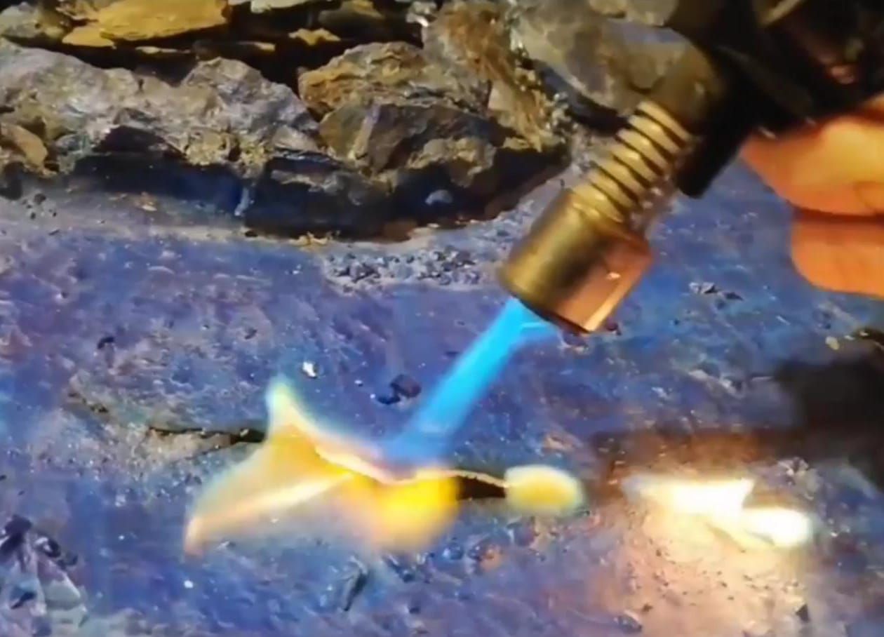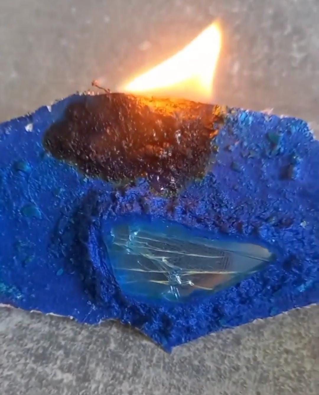 Vorn um die Fackel getupft auffängt die genäherte Flamme.